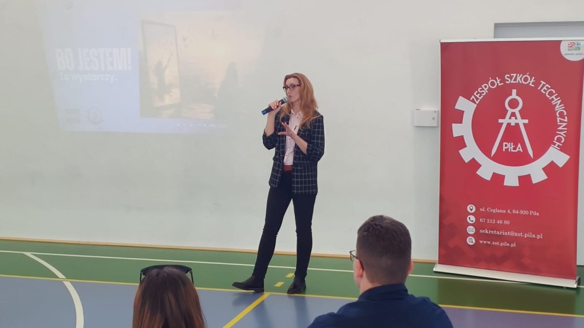 Podczas spotkania młodzież miała okazję wysłuchać niezwykle inspirującego wystąpienia pani Alina Zawada Mentalnie, której serdecznie dziękujemy za to, że po raz kolejny zechciała podzielić się swoją wiedzą i doświadczeniem. Pani Alina opowiedziała o zdrowiu psychicznym, o tym, że każdy z nas jest inny i to jest w porządku, że nie musimy być dobrzy we wszystkim, a ogromną rolę w naszym życiu odgrywa zespół i wsparcie ludzi wokół nas.