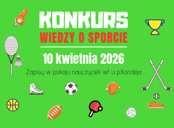 Zapraszam wszystkich miłośników sportu o sprawdzenie się w kolejnej edycji szkolnego konkursu wiedzy o sporcie który odbędzie się w piątek 10 kwietnia o godzinie 8.55 Zapisy w pokoju nauczycieli wf u p.Kondeja